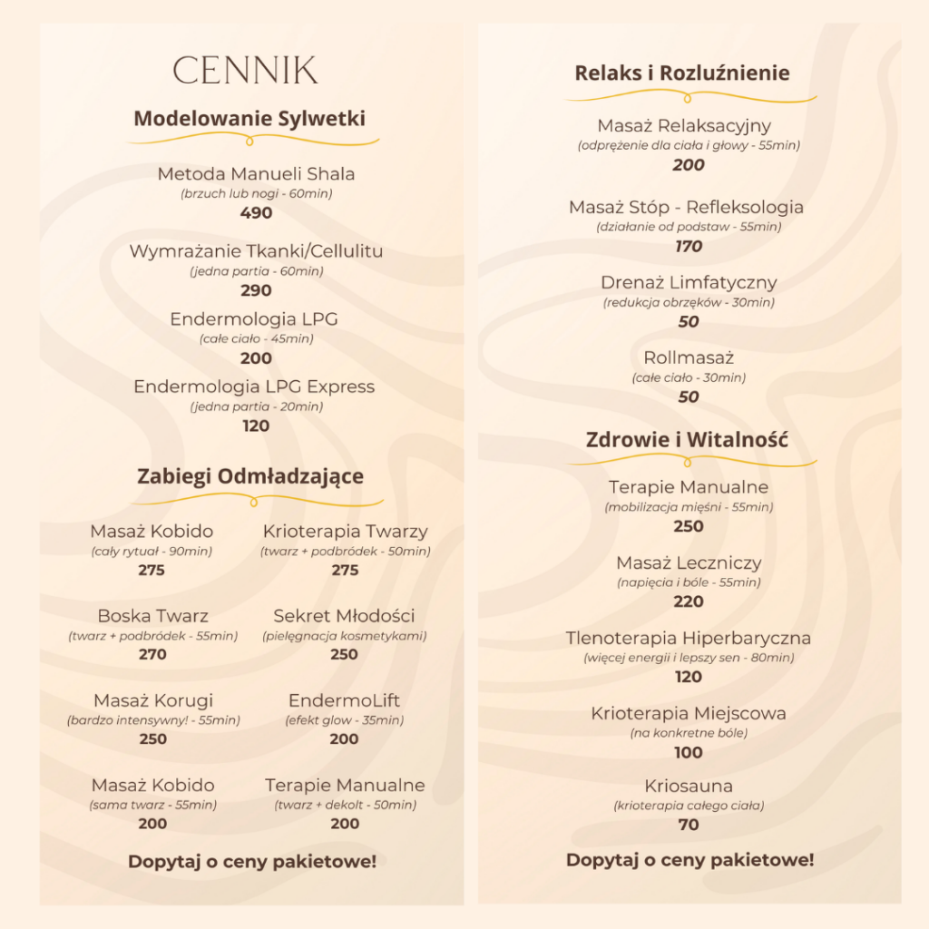Ceny zabiegów w przypadku zakupu pakietu będą ulegały obniżce. Po więcej informacji zadzwoń do nas, lub napisz na Facebook'u.